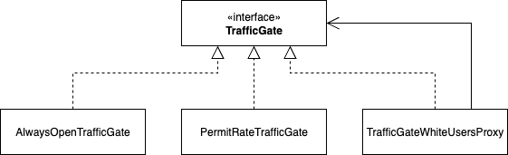 }요구사항에 나와있는 화이트리스트 유저를 제어하는 로직도 추가됐다. TrafficGate 클래스는 요구사항에 따라 지속적으로 변화하고있다. 이 구현을 다형성을 이용해 구현한다면 어떻게 할 수 있을까?
